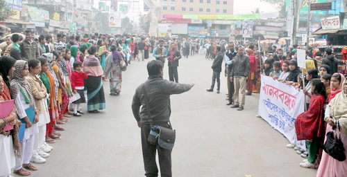 এদিকে দুপুরে হামলাকারী বখাটেকে দ্রুত আটক ও বিচারের দাবিতে ফজর আলী গার্লস স্কুল অ্যান্ড কলেজসহ বিভিন্ন স্কুলের ছাত্রছাত্রী ও শিক্ষক-শিক্ষিকা শহরের পায়রা চত্বরে মানববন্ধন করে। এ সময় বক্তারা আগামী ৩ দিনের মধ্যে অপরাধীকে গ্রেফতার করা না হলে পরবর্তীতে কঠোর কর্মসূচি দেয়ার ঘোষণা দেন।