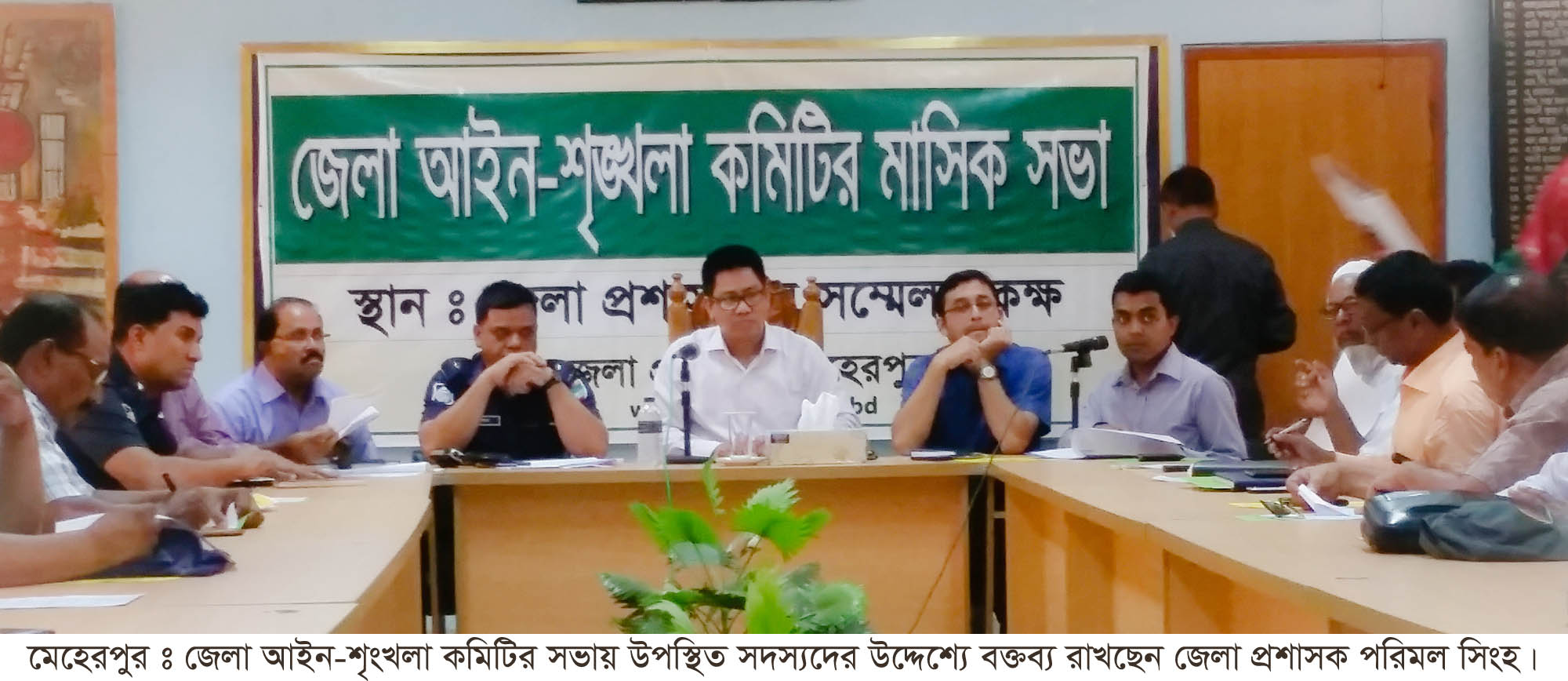 এছাড়াও সীমান্ত এলাকা দিয়ে অবৈধ অনুপ্রবেশ, বয়োবৃদ্ধ ও শিশুদের চলাচলে উপযুক্ত সড়ক ব্যবস্থাসহ বিভিন্ন বিষয়ে আলোচনায় অংশ নেন কমিটির সদস্যবৃন্দ। অনুষ্ঠানে সভাপতিত্ব করেন জেলা আইনশৃঙ্খলা কমিটির সভাপতি ও জেলা প্রশাসক পরিমল সিংহ। এনডিসি নূর-এ আলমের সঞ্চালনায় অনুষ্ঠানে বক্তব্য রাখেন সদর উপজেলা নির্বাহী অফিসার মঈনুল হোসেন, গাংনী উপজেলা নির্বাহী অফিসার আরিফ উজ জামান, অতিরক্ত পুলিশ সুপার আহমার উজ্জামান, সহকারী পুলিশ সুপার (সার্কেল) মোস্তাফিজুর রহমান, সাংবাদিক রফিক-উল আলম, সদর উপজেলা আওয়ামী লীগের সভাপতি গোলাম রসুল, জেলা আওয়ামী লীগের উপদেষ্টা আলহাজ মো. আসকার আলী, সাংগঠনিক সম্পাদক বাগোয়ান ইউপি চেয়ারম্যান আয়ূব হোসেন, গাংনী পৌর মেয়র আশরাফুল ইসলামসহ বিজিবি, মাদকদ্রব্য নিয়ন্ত্রণ অধিদফতরসহ বিভিন্ন দফতরের কর্মকর্তাবৃন্দ।