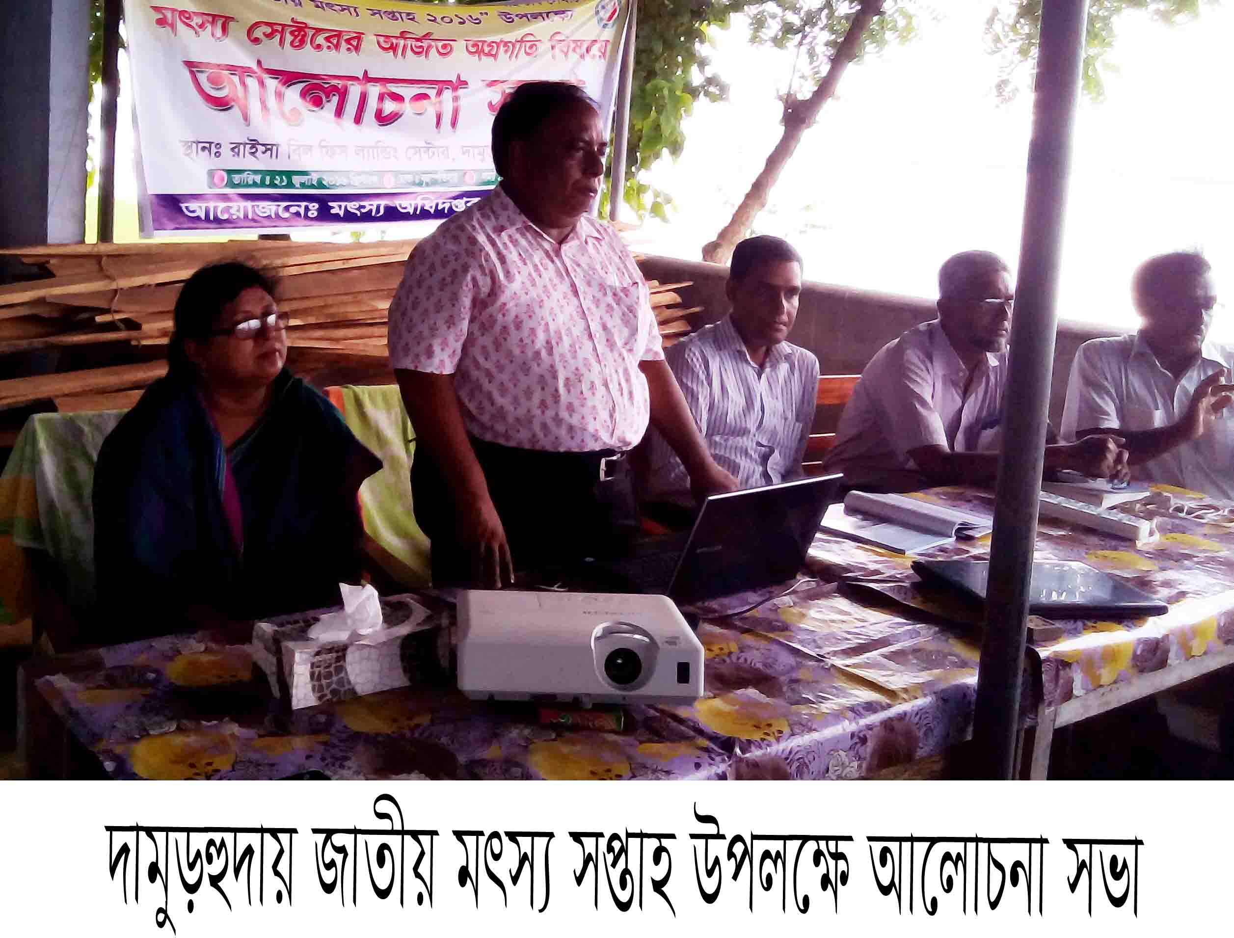 দামুড়হুদা প্রতিনিধি: দামুড়হুদায় জাতীয় মৎস্য সপ্তাহ-২০১৬ উদযাপনের অংশ হিসেবে বর্তমান সরকারের সময়ে মৎস্যখাতে অর্জিত সাফল্য ও অগ্রগতি বিষয়ে মৎস্যজীবীদের সাথে আলোচনাসভা অনুষ্ঠিত হয়েছে। গতকাল বৃহস্পতিবার বেলা ১১টার দিকে উপজেলার কুড়ুলগাছি রায়সা বিল এলাকায় ওই আলোচনাসভা অনুষ্ঠিত হয়। জল আছে যেখানে মাছ চাষ সেখানে এই স্লোগানকে সামনে রেখে রায়সা বিল ব্যবস্থাপনা কমিটির সভাপতি মোহাম্মদ আলীর সভাপতিত্বে অনুষ্ঠিত সভায় প্রধান অতিথি ছিলেন চুয়াডাঙ্গা জেলা মৎস্য অফিসার ফজলুল হক। বিশেষ অতিথি ছিলেন চুয়াডাঙ্গা সদর উপজেলার সিনিয়র মৎস্য অফিসার ফিরোজ আহমেদ, জেলা মৎস্য সম্প্রসারণ কর্মকর্তা মেহেরুন নেছা, দামুড়হুদা উপজেলা উপজেলা কর্মকর্তা আইয়ুব আলী প্রমুখ। অনুষ্ঠানটি পরিচালনা করেন আব্দুর রাজ্জাক সার্বিক সহযোগিতায় ছিলেন আব্দুর রশিদ ও হাদিবুল হাসান।
