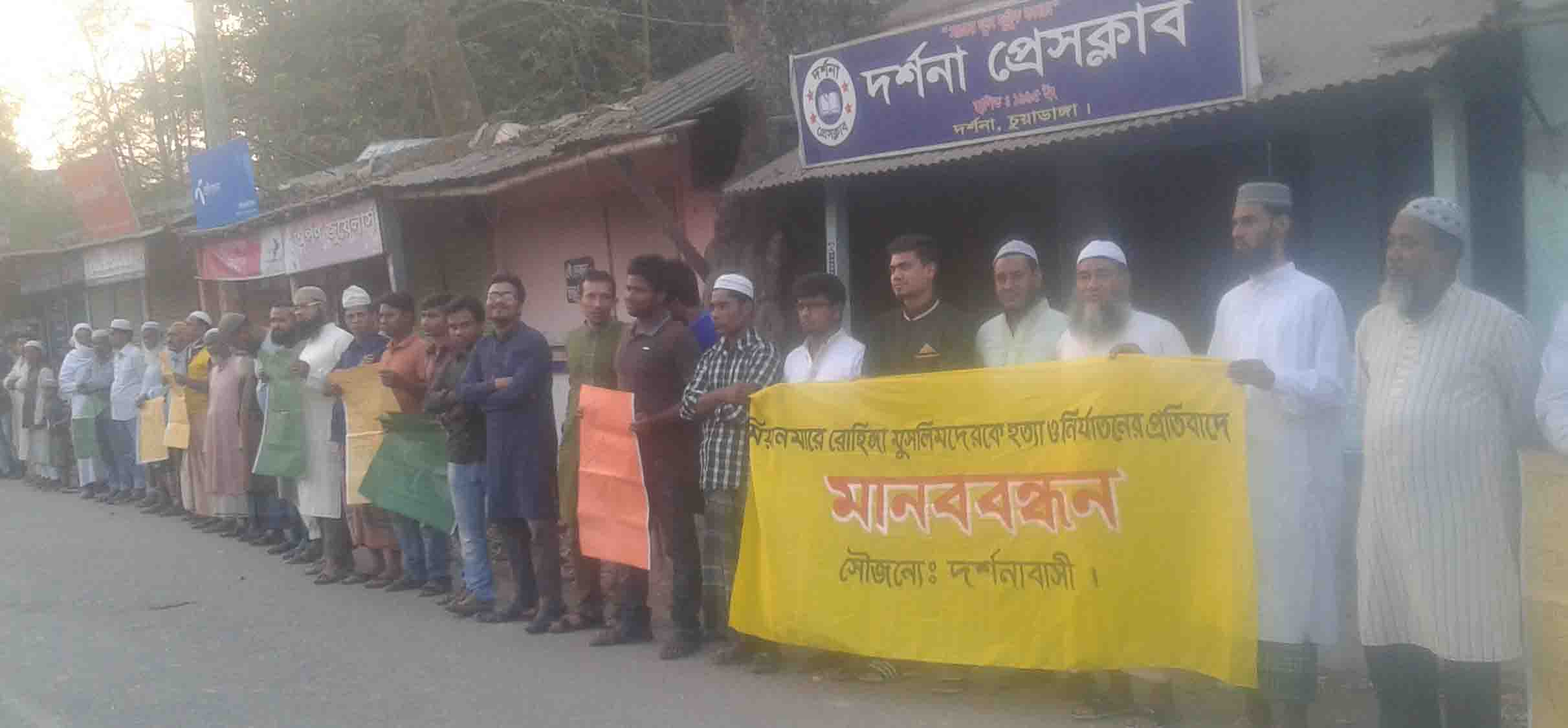 দর্শনা অফিস: প্রতিবেশী দেশ মায়ানমারে মুসলিম জনগোষ্ঠির ওপরে সে দেশের সরকারি বাহিনী পরিকল্পিতভাবে বর্বরোচিত নির্যাতন ও হত্যা চালাচ্ছে। মুসলমানদের হত্যা এবং নির্যাতন বন্ধের দাবিতে দর্শনাবাসী মানববন্ধন ও বিক্ষোভ কর্মসূচি পালন করেছেন। গতকাল শুক্রবার বিকেলে দর্শনা প্রেসক্লাবের সামনে মানববন্ধন ও বিক্ষোভ কর্মসূচিতে দর্শনার সব শ্রেণি-পেশার মানুষ উপস্থিত ছিলেন। বক্তব্যকালে বক্তারা বলেছেন, অবিলম্বে এ হত্যা ও নির্যাতন বন্ধ করতে হবে। মুসলিম রাষ্ট্রগুলোকে এক কাতারে দাঁড়িয়ে নির্যাতনকারীদের বিরুদ্ধে রুখে দাড়াতে হবে। বক্তব্য দেন, দর্শনা রেল বাজার জামে মসজিদের পেশ ইমাম হাজি মুফতি গোলাম কিবরিয়া, মাও শমসের আলী, মাও আব্দুল মালেক, মুফতি মাও হাফিজ, মাও হাদিসুর রহমান, মাও মুনজুর আহম্মেদ, আবুল বাশার, হাজি আব্দুল জলিল, সাজিদুল ইসলাম সুজন ও দর্শনা রেল বাজার দোকান মালিক সমিতির দফতর সম্পাদক মিজানুর রহমান।